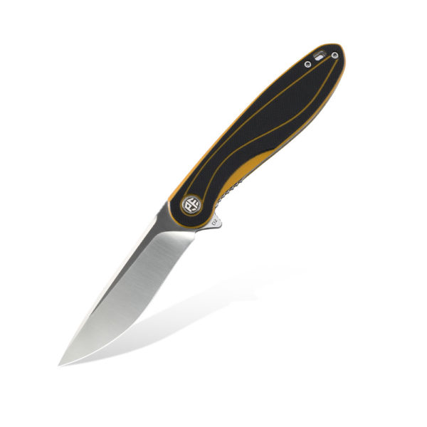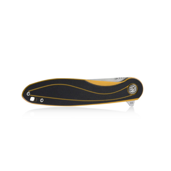 Petrified Fish Skipper PF-858 Y Yellow folding knife has an efficient drop point blade made of D2 steel known for its cutting efficiency and easy to sharpen and care for. The handle of the knife is made of black and yellow G10 composite. The knife is opened due to the protruding flipper and the blade is blocked by a liner lock.