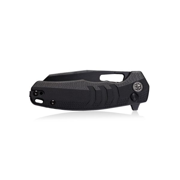 **Prezentowana wersja noża to ostrze w czarnym wykończeniu PVD stonewashed oraz okładki rękojeści z czarnego kompozytu G10. Nóż wyróżniają jeszcze 3 metody otwarcia – flipperem (płetwą), otworem w głowni oraz za sprawą przycisku blokady button lock.