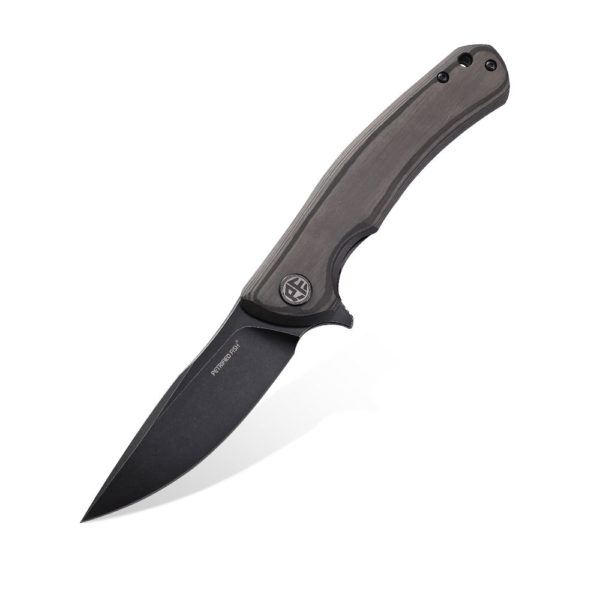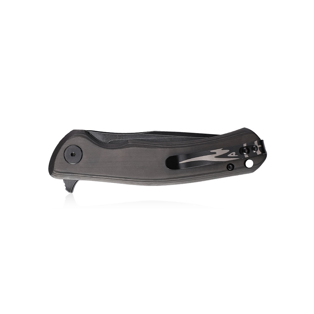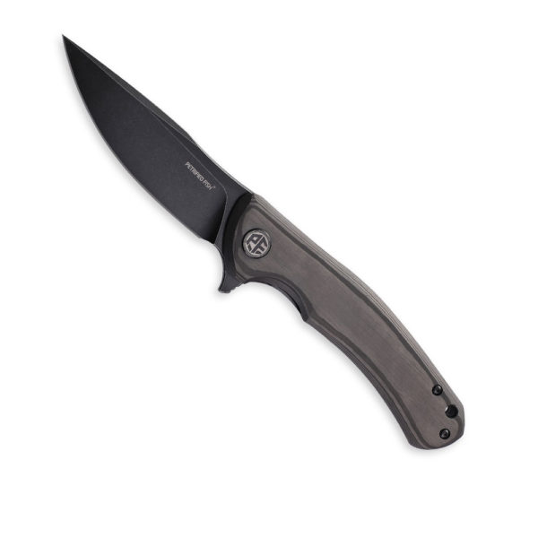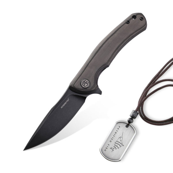 Petrified Fish Warrior PF-949 CDW Carbon Fiber folding knife has an efficient drop point blade made of K110 steel (with black titanium coating). The handle of the knife is made of carbon fiber. The knife’s backspacer is made of carbon fiber and the deep carry clip is made of titanium. The knife is opened due to the protruding flipper and the blade is blocked by a liner lock. Knife comes with steel ID card and lanyard.