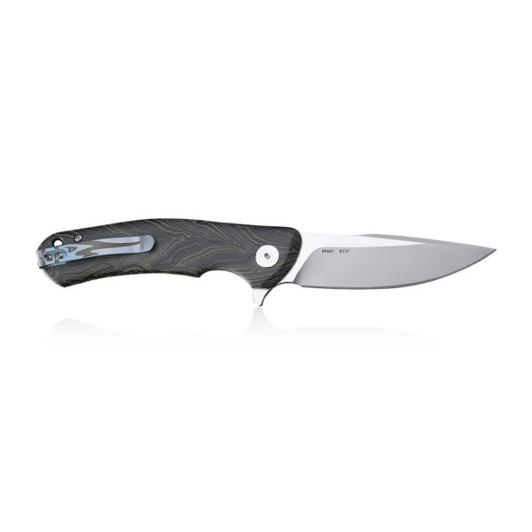Petrified Fish Warrior PF-949 GR Damask Pattern folding knife has an efficient drop point blade made of K110 steel. The handle of the knife is made of G10 composite formed in a damascus pattern. The knife’s backspacer is made of carbon fiber and the deep carry clip is made of titanium. The knife is opened due to the protruding flipper and the blade is blocked by a liner lock. Knife comes with steel ID card and lanyard.