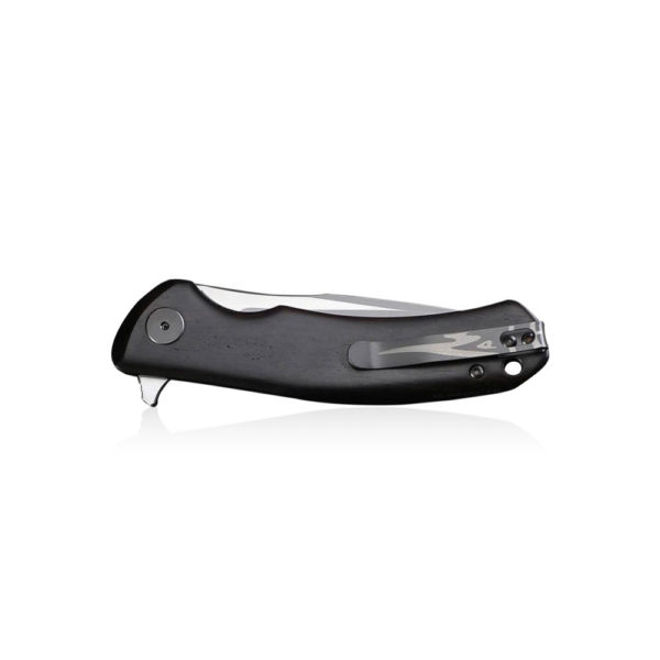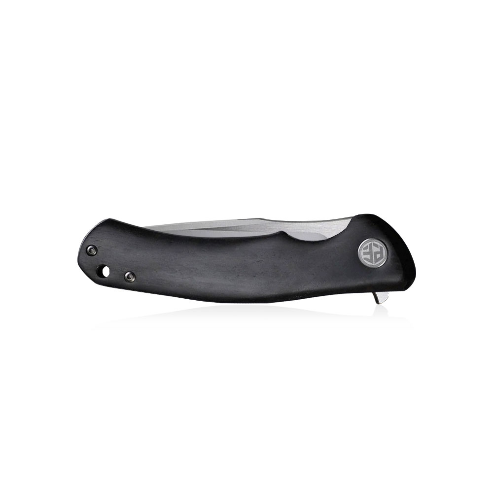 Petrified Fish Warrior PF-949 WOB Black Ebony folding knife has an efficient drop point blade made of K110 steel. The handle of the knife is made of black ebony wood. The knife’s backspacer is made of carbon fiber and the deep carry clip is made of titanium. The knife is opened due to the protruding flipper and the blade is blocked by a liner lock. Knife comes with steel ID card and lanyard.