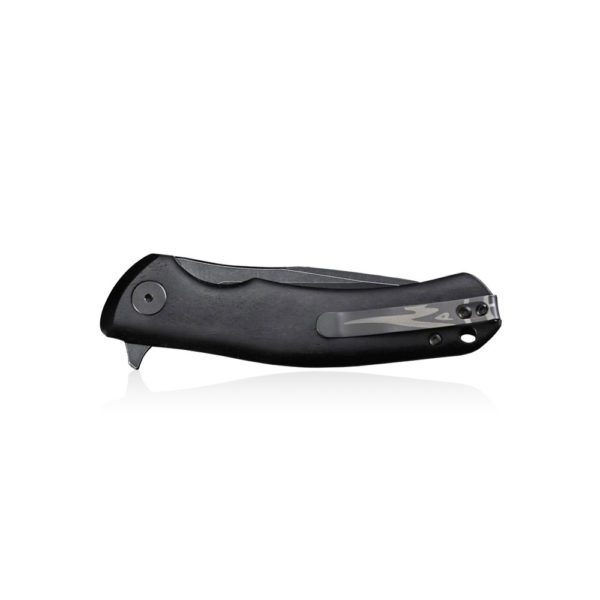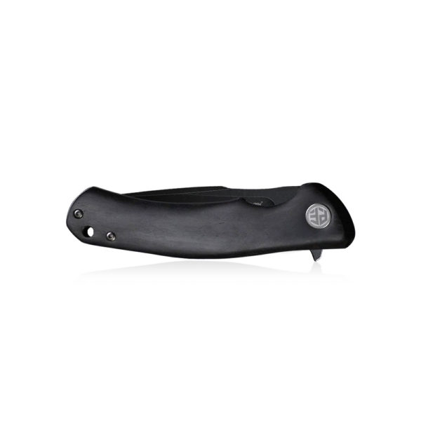 Petrified Fish Warrior PF-949 WOB Black Ebony folding knife has an efficient drop point blade made of K110 steel (with black titanium coating). The handle of the knife is made of black ebony wood. The knife’s backspacer is made of carbon fiber and the deep carry clip is made of titanium. The knife is opened due to the protruding flipper and the blade is blocked by a liner lock. Knife comes with steel ID card and lanyard.
