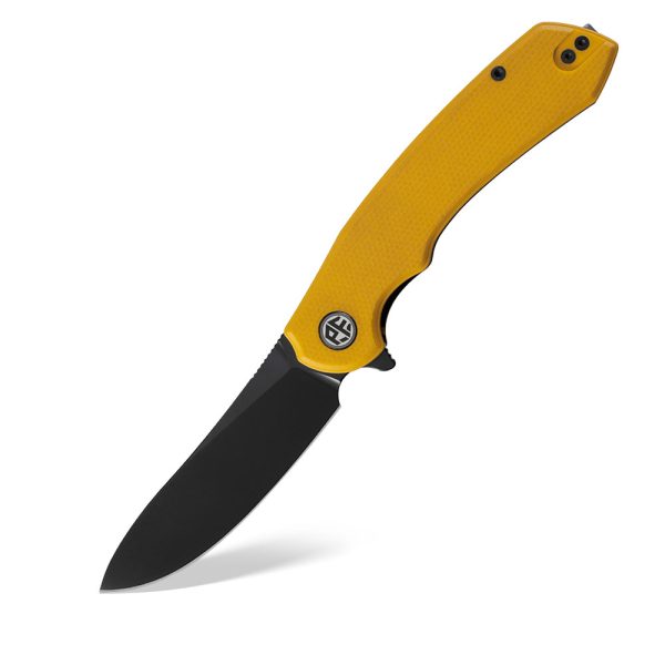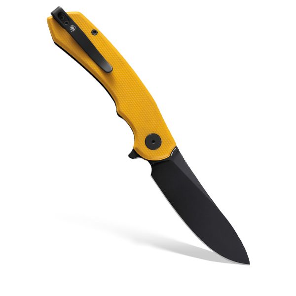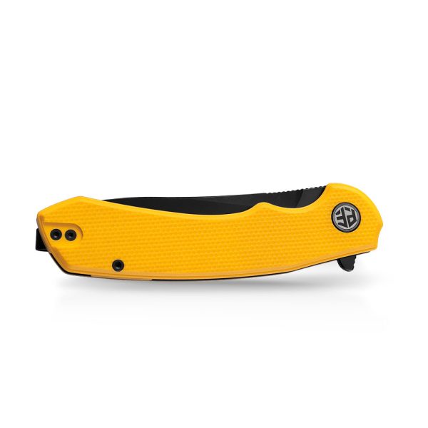 - Rękojeść: Żółty kompozyt G10, stalowe linersy, klips stalowy (Tip-Up, Deep Carry, przekładalny na drugą stronę)