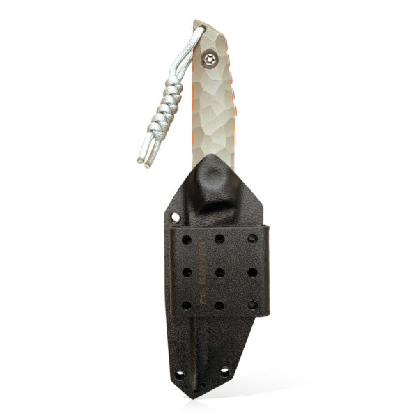 PG Knives | Piotr Gosciniak Compact Tanto Knife | Elmax Desert Tan G10 has a premium Elmax steel blade with a two-tone finish (satined and sandblasted). There is a fuller on the blade. The handle is made of Desert Tan G10 composite with orange spacers made of the same material. At the end of the handle was design glass breaker. The knife comes with a black kydex holster.