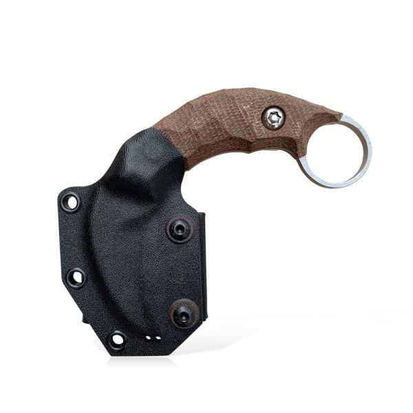 PG Knives | Piotr Gosciniak Kiwi Karambit Knife| Elmax Brown Micarta has a premium Elmax steel blade with a two-tone finish (satined and sandblasted). The handle is made of brown micarta. The knife comes with a black kydex holster.