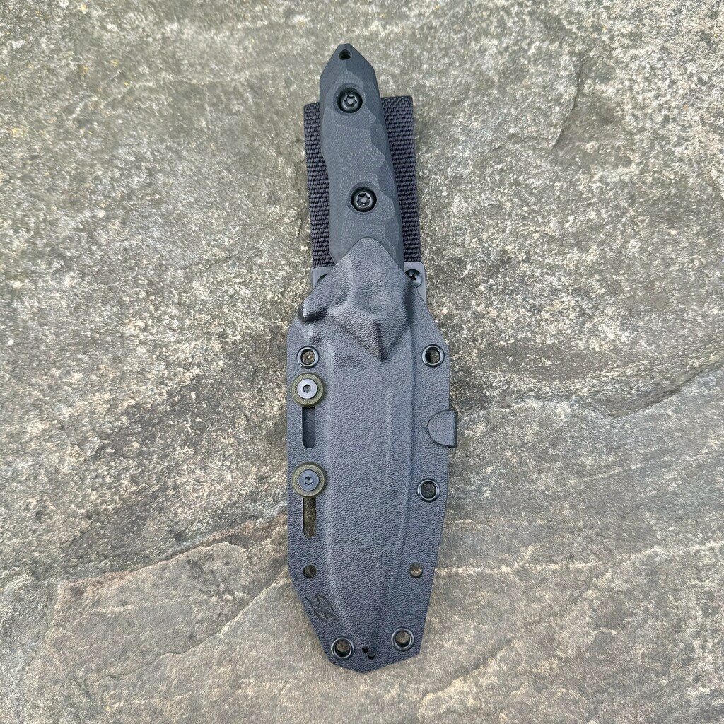 The knife comes with a sheath made from hand-formed Kydex, which can be attached to a belt using a nylon belt loop. Kydex is an extremely durable material known for its high impact and scratch resistance, low moisture absorption, and resistance to various weather conditions and many chemicals. Sheaths made from this material offer comfort and longevity. The sheath is equipped with through pins, which can be used to attach accessories like a fire starter holder (not included) or to secure the sheath to a backpack, harness, or MOLLE system.