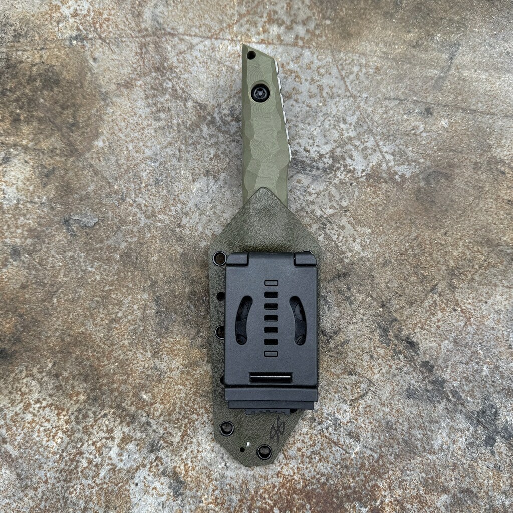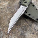 The knife boasts a excellent premium Elmax steel blade with a two-tone finish (satin and sandblasted). The blade features a double-sided fuller. The handle is crafted from olive G10 composite with ‘charcoal grey’ spacers made of the same material. The knife comes with an olive Kydex sheath with a tek-lok buckle..
