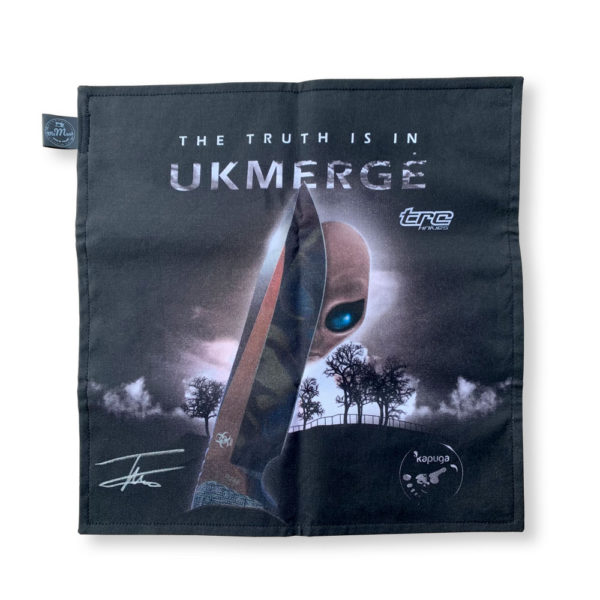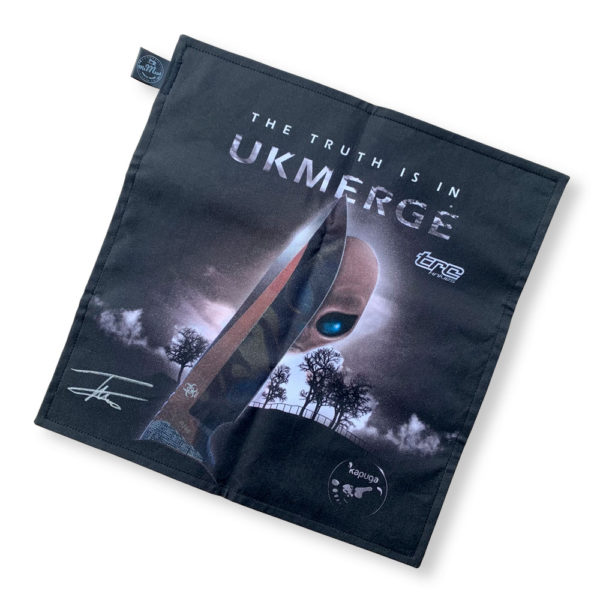 As some of you have been already experienced, life is ruled by chance. Working with the great TRC Knives brand, we have the opportunity to experience great work organization, detail and quality. It would seem that everything at TRC has been planned. Not necessarily! Andrius Tricius and his team leave some of the results of their work to chance! Indeed! The Apocaliptic finish, in which the TRC Knives team specializes, can surprise you with a plethora of colors, the intensity of shades, and most of all, the fancy of the obtained effect! Each knife with this finish is unique and one of a kind, an example of which is the pattern on the blade of the Apocalypse knife that forms the silhouette of an alien, once in our offer and today owned by one of you! We decided to honor such a unique case by making EDC hankie with the “Alien” theme, which is also a tribute to the “Biohazard” knife series, consisting of many unique blades produced over the last two years.