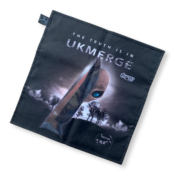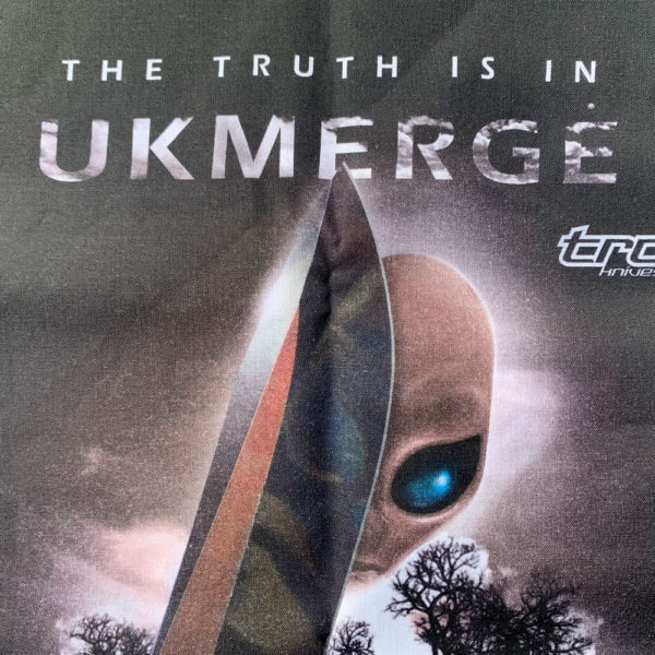 As some of you have been already experienced, life is ruled by chance. Working with the great TRC Knives brand, we have the opportunity to experience great work organization, detail and quality. It would seem that everything at TRC has been planned. Not necessarily! Andrius Tricius and his team leave some of the results of their work to chance! Indeed! The Apocaliptic finish, in which the TRC Knives team specializes, can surprise you with a plethora of colors, the intensity of shades, and most of all, the fancy of the obtained effect! Each knife with this finish is unique and one of a kind, an example of which is the pattern on the blade of the Apocalypse knife that forms the silhouette of an alien, once in our offer and today owned by one of you! We decided to honor such a unique case by making EDC hankie with the “Alien” theme, which is also a tribute to the “Biohazard” knife series, consisting of many unique blades produced over the last two years.