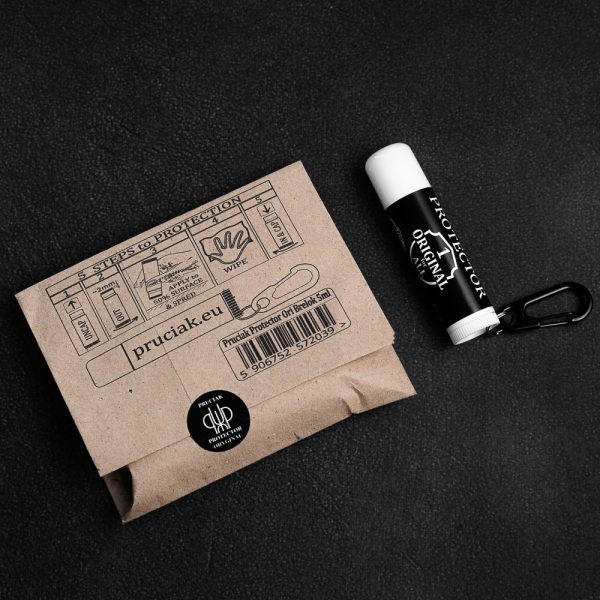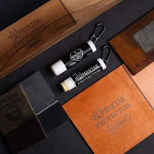 At the moment, the Pruciak Protector product family includes waxes: Protector Original, Protector Blade, Protector Leather, Protector Wood (formerly Exotic), Protector Atena, Protector Razor and the oil Protector Glide. The products are made of only natural ingredients that are safe in contact with food. The wax family has been designed in the form of convenient applicators, in the form of a lipstick. The sticks are very easy to use, take up a minimum amount of space, making them easy to take with you on a trip or in the field. The oil is distributed in the form of a bottle with a convenient dropper, it is also easy to use and compact.