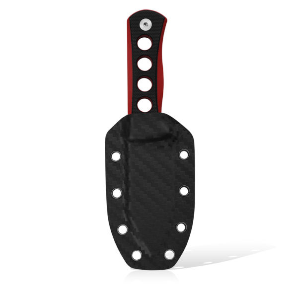The handle of the knife is made of black-red G10 composite and attached to the steel structure with screws. It has an ergonomic shape for a comfortable grip. The whole handle has been significantly slimmed down thanks to several holes, creating a very attractive, diversifying design pattern. At the base of the handle we will find a small size finger gard, preventing the hand from slipping onto the cutting edge.
