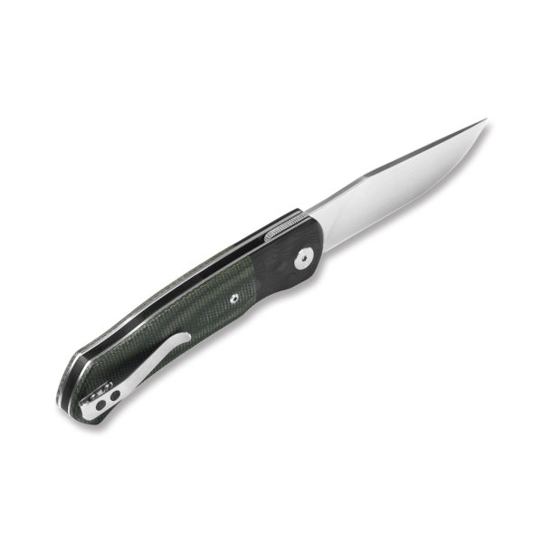 The handle of the knife is made of light and durable carbon fiber combined with a linen micarta with an interesting pattern. The knife is equipped with a steel clip that allows for a secure attachment when carrying it in a pocket, in a backpack, organizer, kidney etc. thus obtaining a closed profile like in a classic pocket knife.