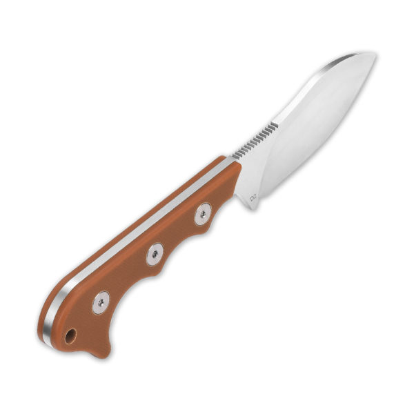It is a knife with a stable blade of a full slimline cut and a blade in the nessmukt style. The shape and size of the blade predisposes its use in light camp work, for preparing meals etc. The D2 tool steel blade has excellent cutting properties and has a high abrasion resistance. The blade has crimping (jimping), which supports the thumb during cuts requiring pressure and facilitates blade guidance.