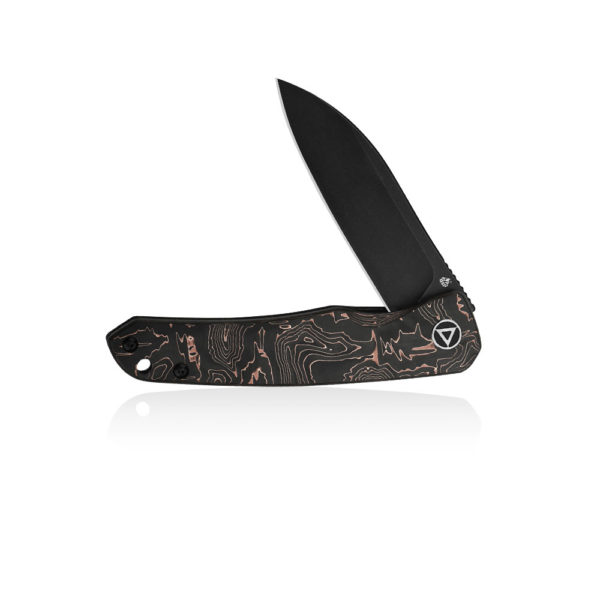 QSP Knife Otter QS140-B2 Folding Knife Black Stonewashed S35VN Copper Foil Carbon Fiber it has a carbon fiber handle with copper threads. The black blade made of American S35VN steel is opened thanks to the flipper sticking out of the blade, and it is secured by a liner lock against folding during operation.