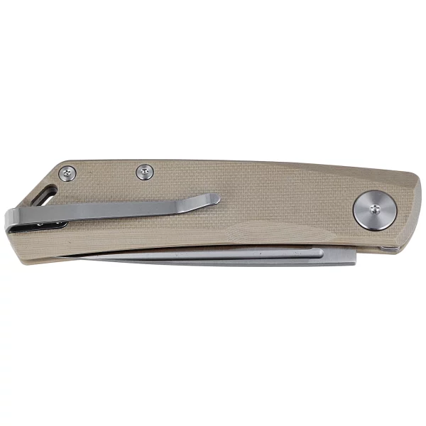 Rękojeść z G10, czyli włókna szklanego prasowanego pod ciśnieniem z syntetyczną żywicą, posiada wygodną fakturę, która zapewnia pewny chwyt nawet w trudnych warunkach. Duża śruba pivota to charakterystyczny element projektów Jakuba Wieczorkiewicza. Solidny backspacer zapewnia sztywność i wytrzymałość całej konstrukcji. Prosta i pewna budowa tego noża sprawiają, że można go używać przez wiele lat. Jednopozycyjny klips typu deep carry, zamontowany po prawej stronie, umożliwia przenoszenie noża w pozycji tip-up, z czubkiem ostrza ku górze. To elegancki i funkcjonalny folder, który spełni oczekiwania najbardziej wymagających użytkowników.