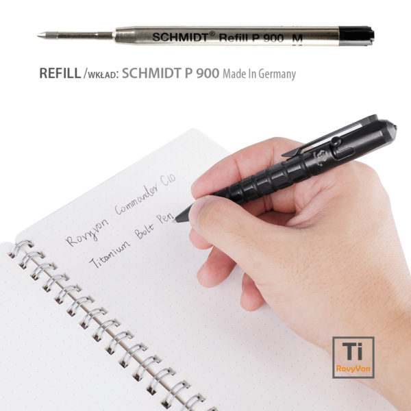 Commander C10 is a pen with tactical features equipped with a black refill. Made In Germany Schmidt P900 refill presents a very nice line of writing. The refill is pulled out by a bolt mechanism located at the top of the pen.