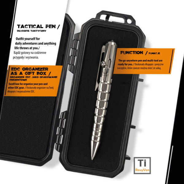 EDC organizer RovyVon®, made of durable polycarbonate for storing a pen (can be used as a pencil case) or other accessories not included in the presented set, such as a flashlight, folding knife, pen etc. Organizer dimensions: 178 x 82 x 34 mm. More about the features of the organizer itself can be found HERE.