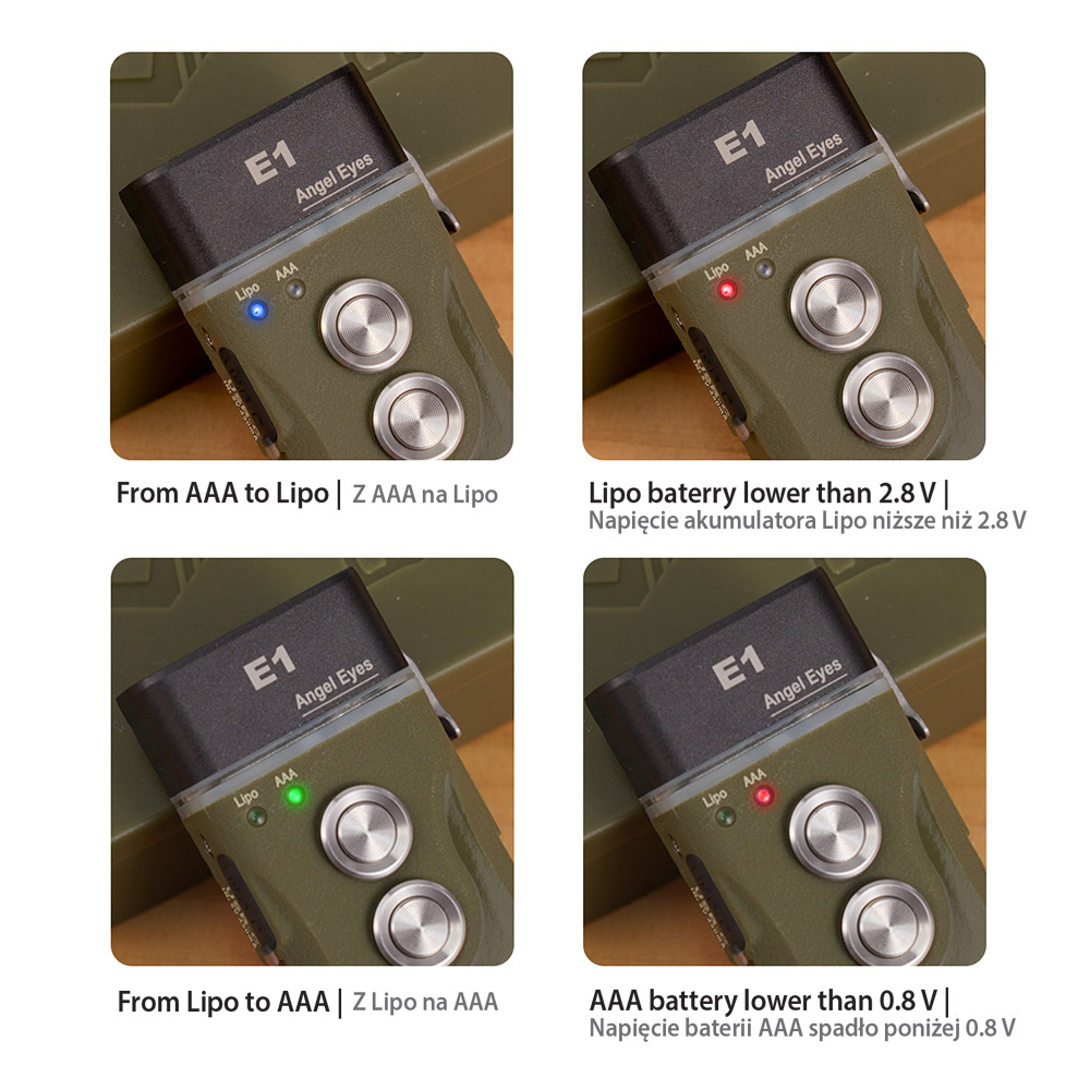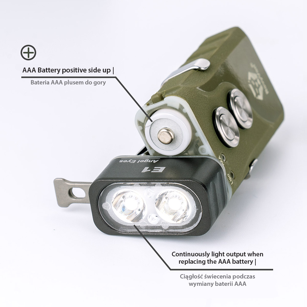 The E1 has some changes compared to the first Angel Eyes model – E3, other than the material. It has a dual button, one has the same function as the E3 and another button is dedicated for quick access to Strobe and Momentary on. And the charging indicator method is different as well, breathing blue is in charge and the charge complete is solid green.