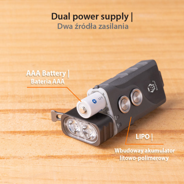 The Angel Eyes E1 is powered by the RovyVon hybrid battery system, the built-in Lipo battery is for daily use and high performance and the replaceable AAA battery is for long runtime like camping, hiking, etc., or where there’s no access to charge the Lipo battery. The E1 body is made of polyamide that is lightweight and durable, it weighs 39g.