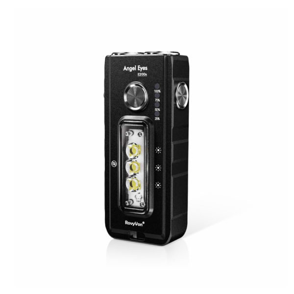 Angel Eyes E200 to linia latarek RovyVon swoim pomysłem odchodząca od klasycznych projektów cylindrycznych. W zamyśle twórców design ma wnieść nutę świeżości do świata latarek zdominowanego przez owalne kształty. Odejście od cylindrycznej obudowy, oprócz ciekawego wyglądu, pozwoliło na umieszczenie w niej baterii o większej pojemności, co w połączeniu z wydajnymi diodami przełożyło się na bardzo dobre efekty użytkowe w postaci m.in. długiego czasu działania.