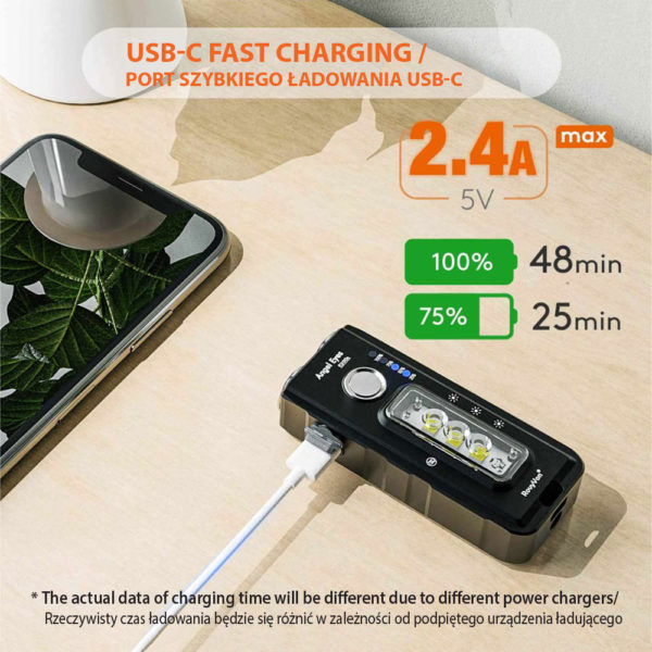 Latarka pozostaje szczelnie zamknięta (akumulator nie jest wymienialny). Port USB-C został zabezpieczony silikonową wkładką. Dzięki temu latarka jest odporna na wilgoć i zapylenie w stopniu odpowiadającym normie IP67, co oznacza że posiada ochronę przed skutkami zanurzenia w wodzie na głębokość do 1 metra przez około 30 minut.