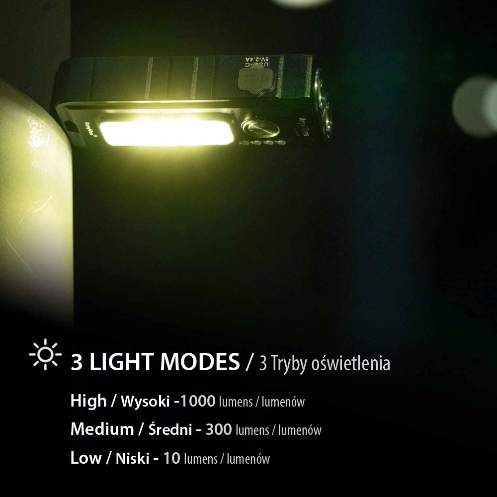 W przypadku oświetlenia bocznego użytkownik ma do dyspozycji 3 tryby pracy stałej latarki: niski, średni i wysoki oraz oświetlenie chwilowe podczas trzymania przycisku. Do dyspozycji mamy również tryb błyskowy – strobo mogący pełnić funkcję sygnalizacyjną do oznaczania swojej pozycji oraz funkcję obronną przed potencjalnym napastnikiem, czy agresywnym zwierzęciem.