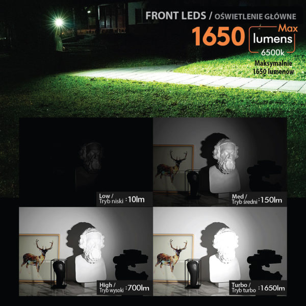 - Max output of 1650 lumens for the front LED of E200s and E200u, CREE XP-G3 x 2