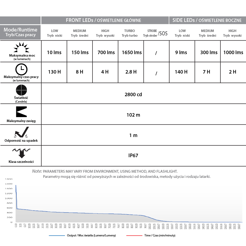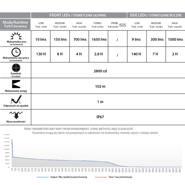 NUMBER OF WORKING MODES: 7 (front LED), 4 (sied LEDs)