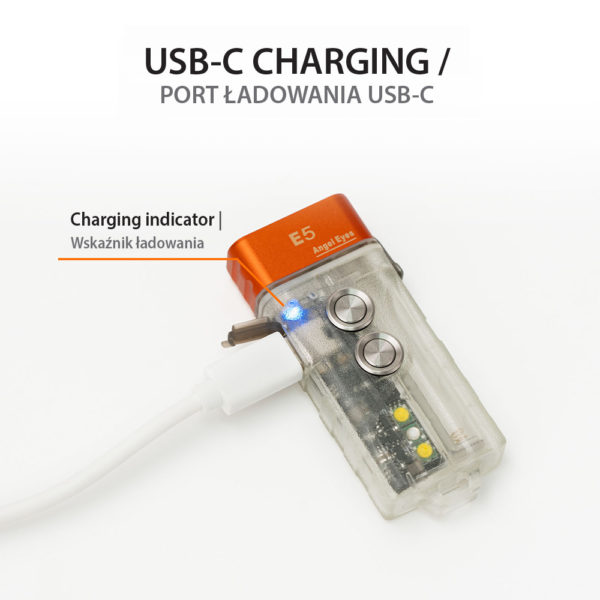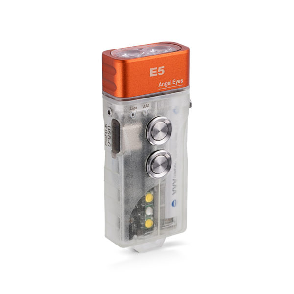 The Angel Eyes E5 has a dual button design – button 1 for primary light and button 2 for side LEDs, making the user interface more apparent and accessible.