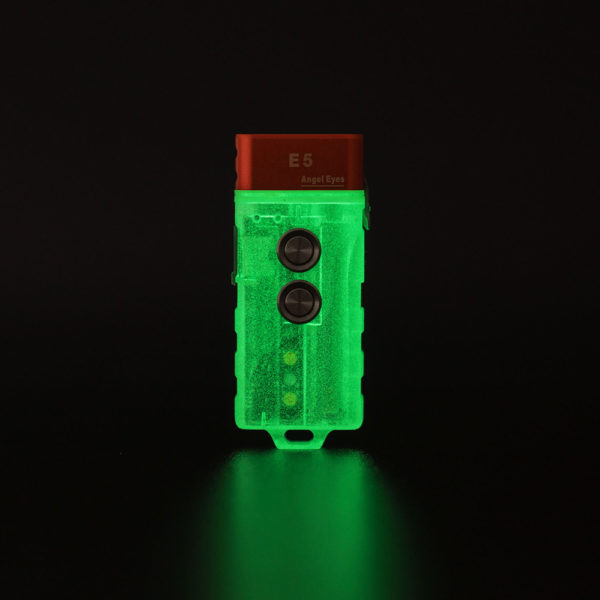 The E5 has dual LEDs for primary that you can choose from 6500K cool white or 4000K warm white high CRI (color rendering index). Like the first GITD keychain light – Aurora A5, it has 3 LEDs on the front side, you can choose from white/UV or white/Red. The UV LED is mainly designed to charge the GITD body to get brighter and last longer.