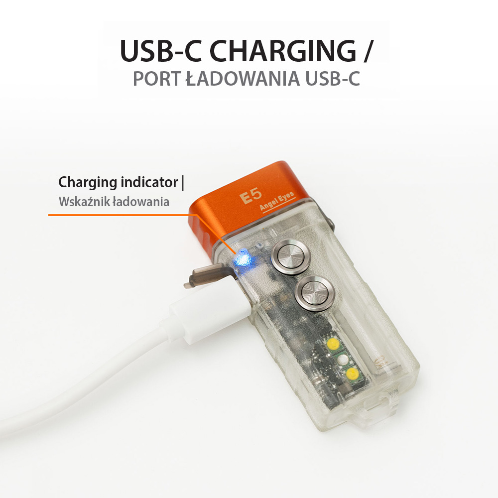 The Angel Eyes E5 is a compact yet bright EDC flashlight, it’s lightweight and durable thanks to its GITD polycarbonate material body. It’s equipped with an ST-20 6500K cool white LEDs, a max output of 700 lumens. It runs a 330 mAh battery that can be charged via the USB-C port and a AAA batery.