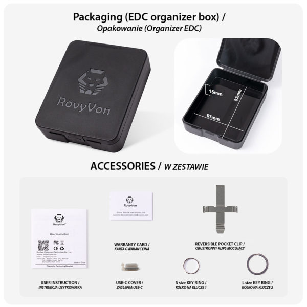 Accessories: User Manual*1, Key Ring(Size L) *1. Keychain Ring(Size S) *1, Pocket Clip *1, and warranty Card*1
