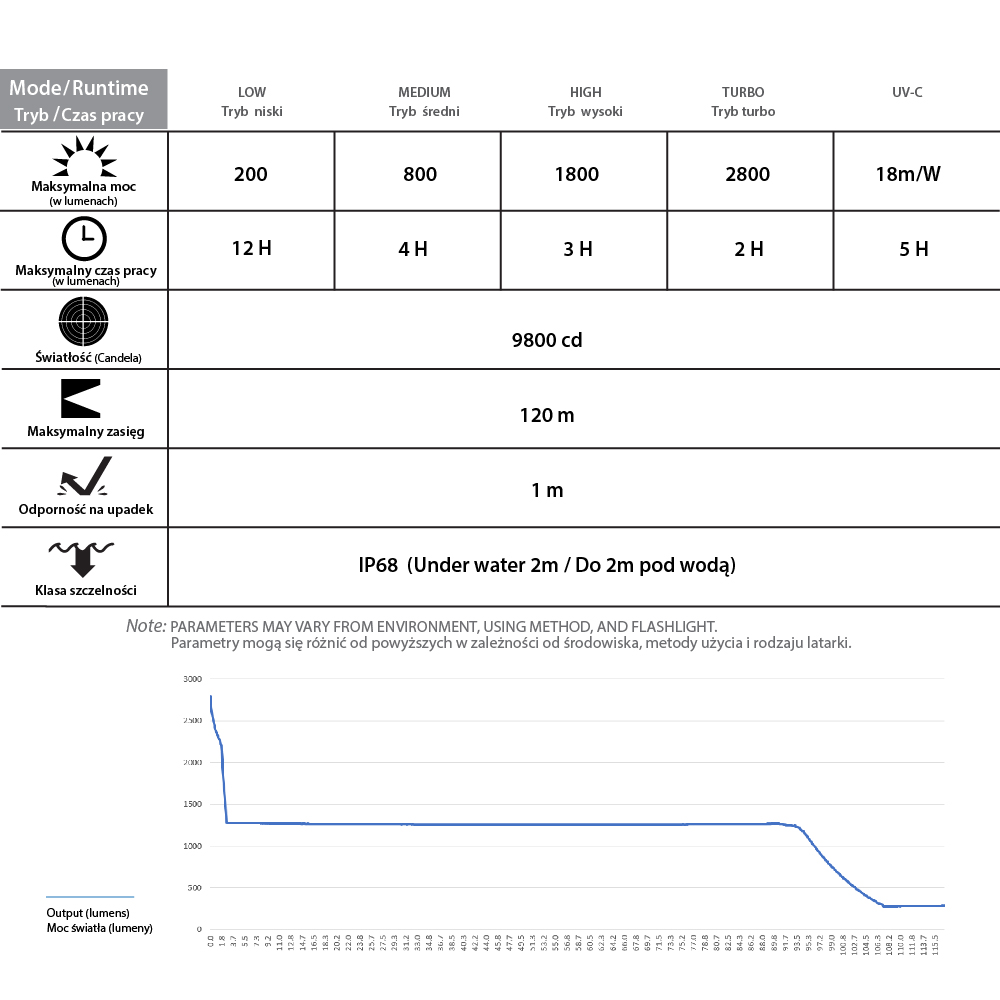 W przypadku oświetlenia głównego użytkownik ma do dyspozycji 5 trybów pracy latarki: tryb chwilowego podświetlenia (turbo) oraz 4 tryby światła stałego: niski, średni, wysoki, turbo.