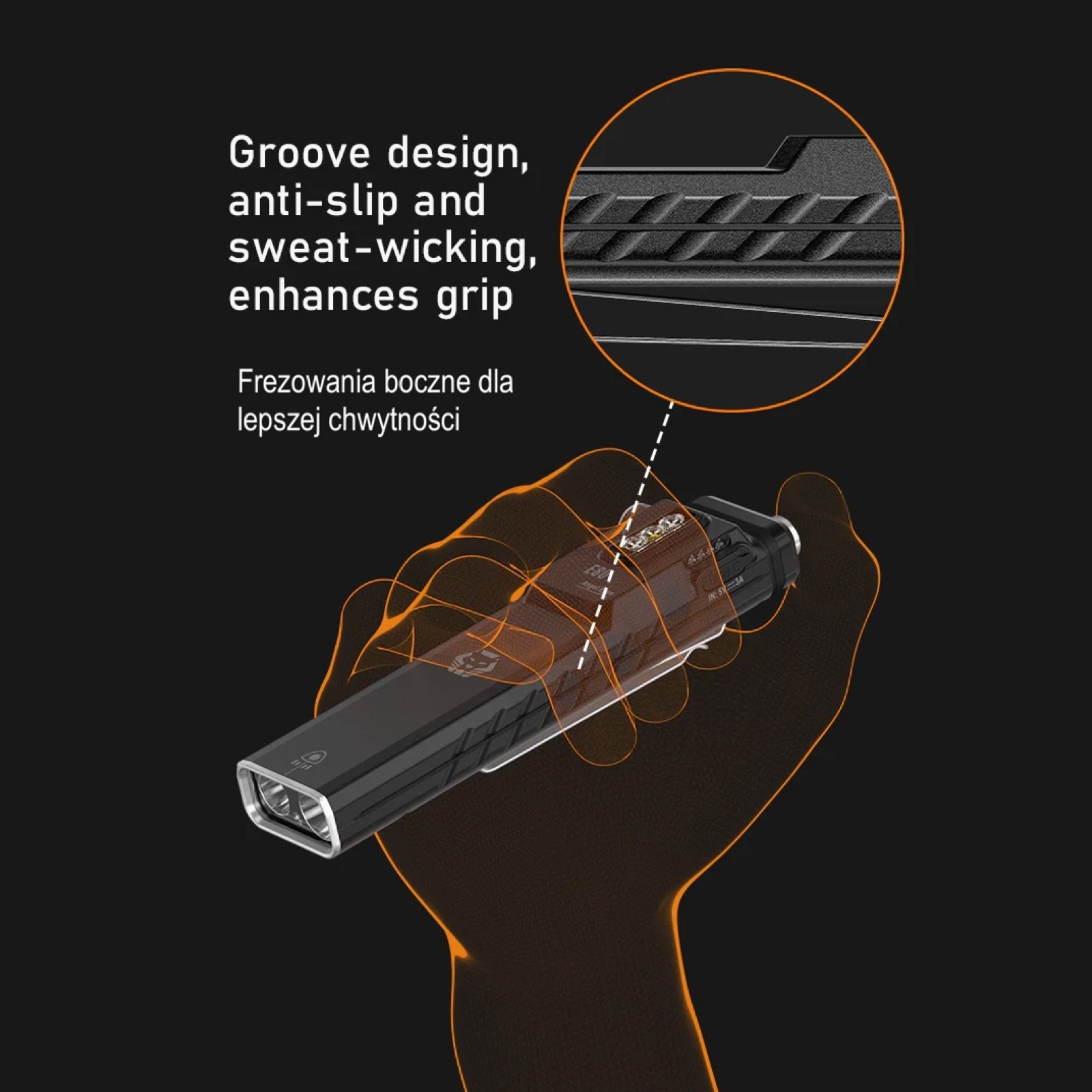 **ALUMINIOWA BUDOWA**: Korpus latarki posiadający frezowania boczne dla lepszej chwytności, powstał z lekkiego i wytrzymałego aluminium 6063. Kolor korpusu uzyskany został w wyniku procesu anodyzacji (Hard Anodization/HAIII Anodization). Uzyskana w wyniku procesu warstwa z kolorem jest gruba, co zapewnia wysoką odporność powierzchni na zarysowania.