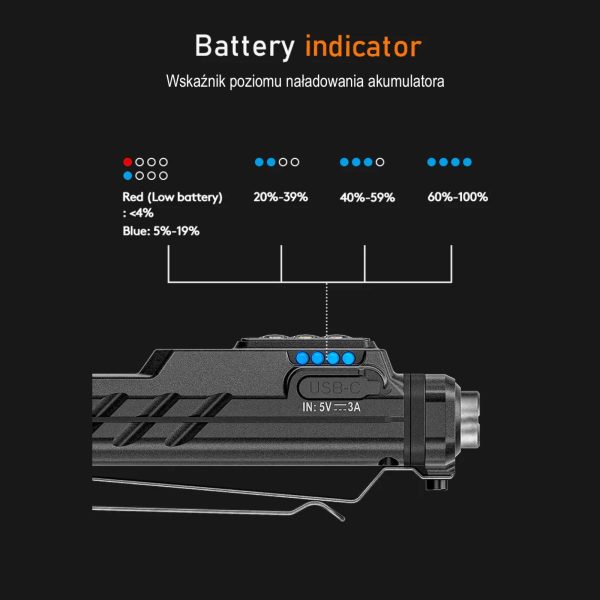 **PORT ŁADOWANIA USB-C**: Ładowanie latarki odbywa się za sprawą portu szybkiego ładowania USB-C a poziom naładowania akumulatora w danym momencie, lub przypomnienie o konieczności jego naładowania pokazują 4 diody sygnalizacyjne. Akumulator litowo-polimerowy (LIPO) posiada pojemność 3000 mAh.