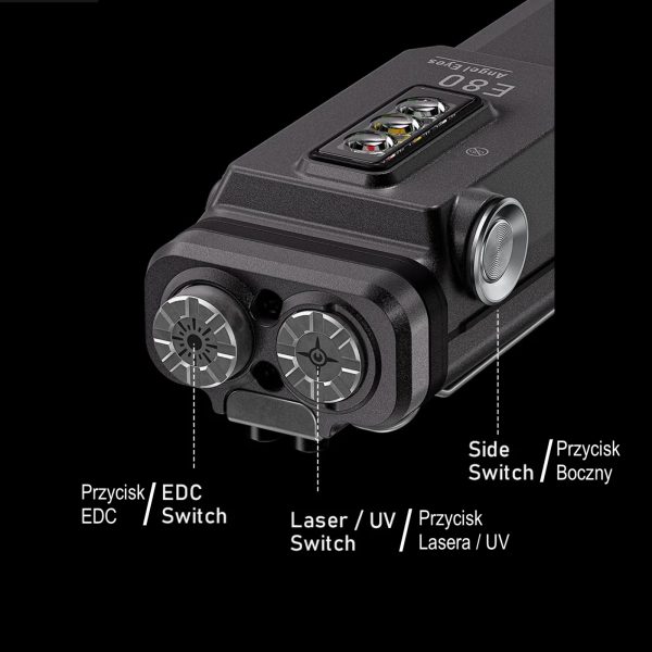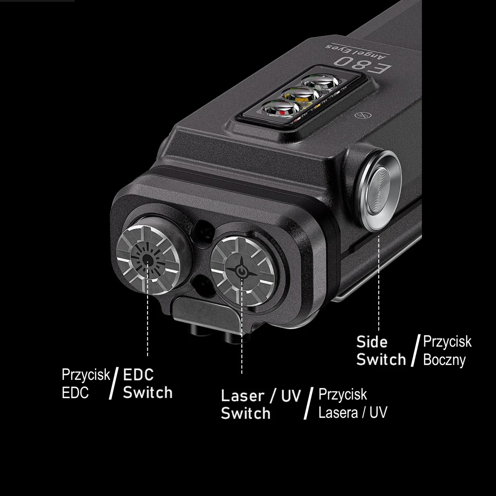 Latarka RovyVon Angel Eyes E80 7000K Cool White & Laser + White/Red/UV Black EDC Specjalistyczna Akumulator 1800 Lumenów to solidne i posiadające funkcje specjalne żródło światła. E80 oferuje: