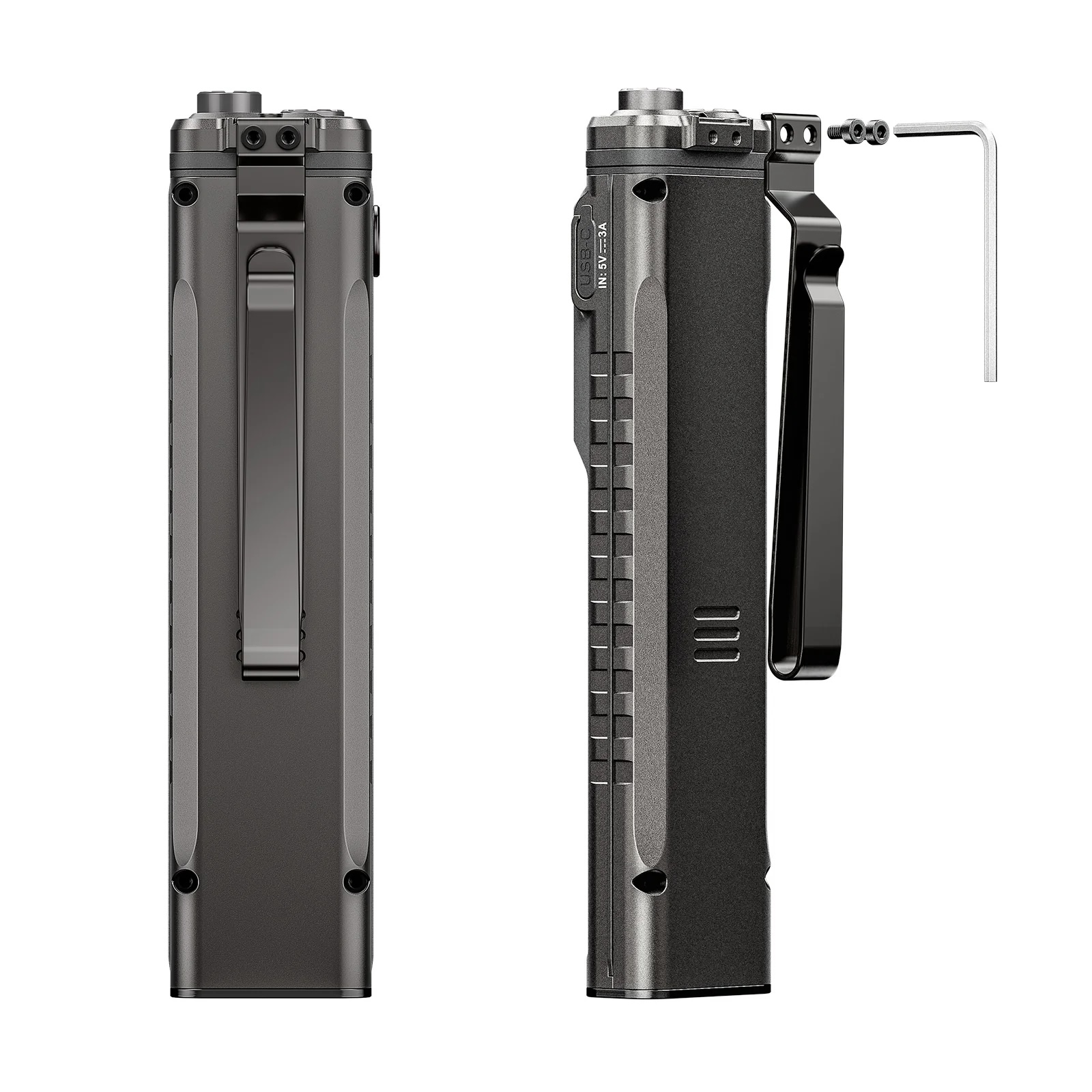 **STALOWY KLIPS DO PRZENOSZENIA**: Montowany na latarce klips służy do jej przypięcia do elementu odzieży (kieszeni spodni, koszuli, rękawa), saszetki, torby, plecaka, itd. Jego konstrukcja sprawia, że latarkę można zamontować w obu kierunkach (diodą do przodu lub tyłu).