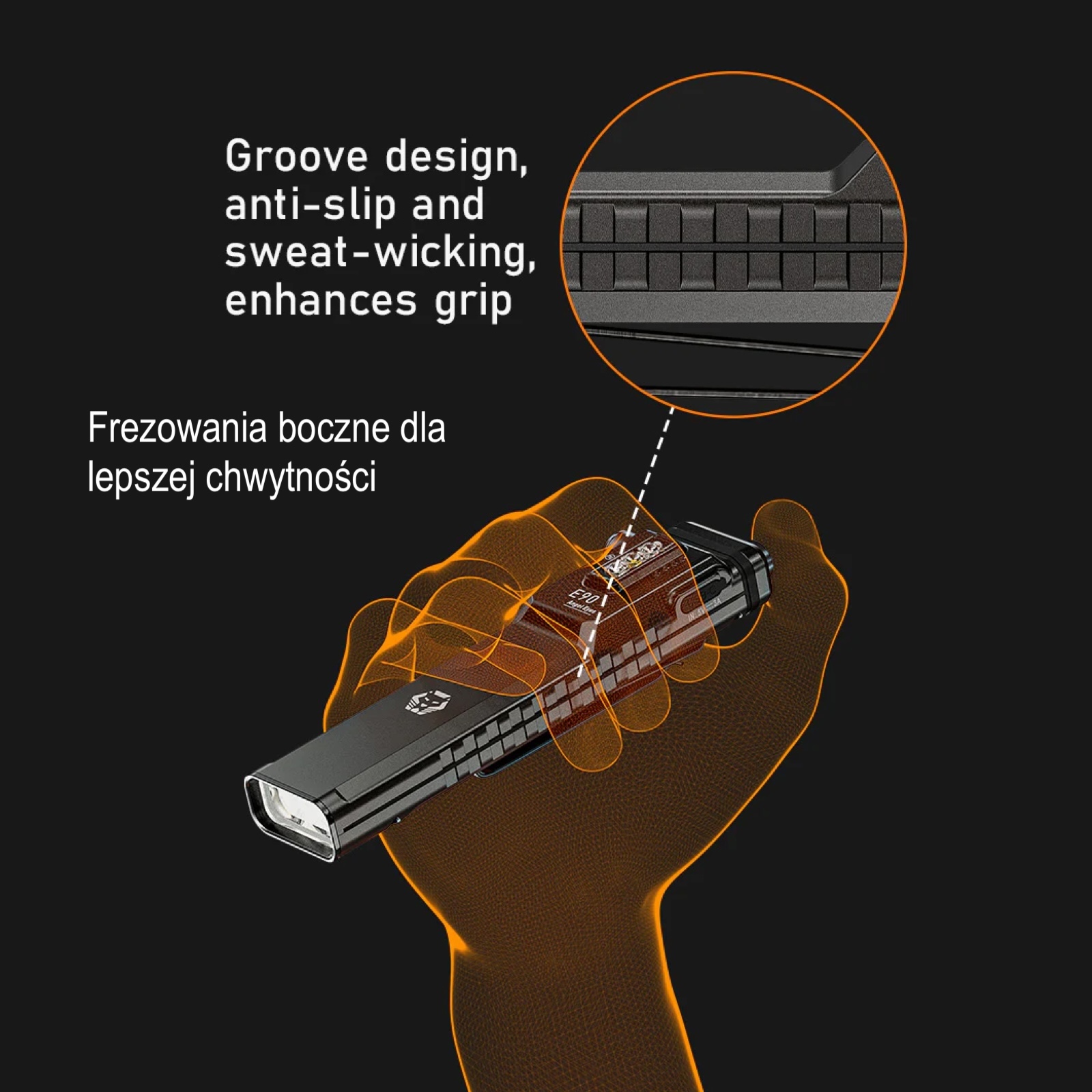 **CZUJNIK ZBLIŻENIOWY**: W warunkach słabego oświetlenia dostępny czujnik zbliżeniowy pomaga zachować naturalne widzenie w nocy, automatycznie przyciemniając światło, gdy znajduje się ono blisko powierzchni. Funkcję tę można zablokować jeżeli nie jest akurat potrzebna. Funkcja nie tylko wyróżnia latarkę na tle produktów innych marek, ale wydłuża również żywotność akumulatora.