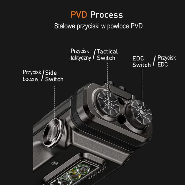 **DWA PRZYCISKI TYLNE DLA ŁATWEJ OBSŁUGI**: Jeden z przycisków uruchamia funkcje codzienne (tryby światła stałego) a drugi tryby taktyczne.