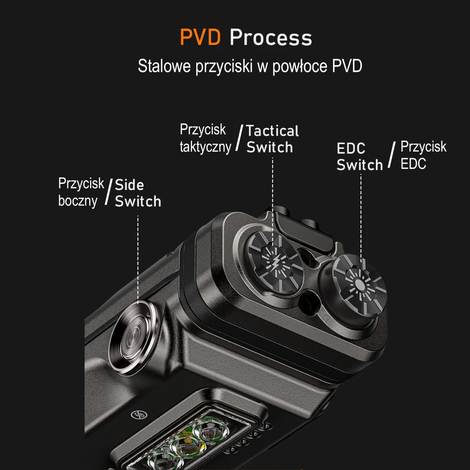 **ALUMINIOWA BUDOWA**: Korpus latarki posiadający frezowania boczne dla lepszej chwytności, powstał z lekkiego i wytrzymałego aluminium. Cały korpus i obudowa diod LED wykonane są z tego materiału. Kolor korpusu uzyskany został w wyniku procesu anodyzacji (Hard Anodization/HAIII Anodization). Uzyskana w wyniku procesu warstwa z kolorem jest gruba, co zapewnia wysoką odporność powierzchni na zarysowania. Przyciski dla jeszcze większej odporności przed ścieraniem pokryto warstwą tytanową (PVD).