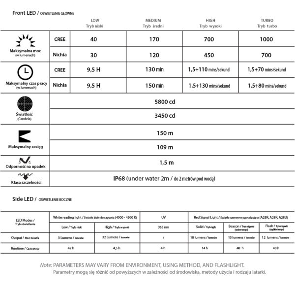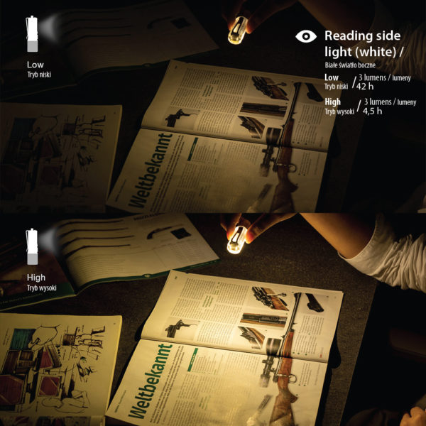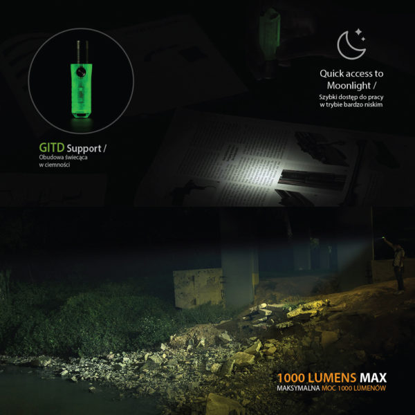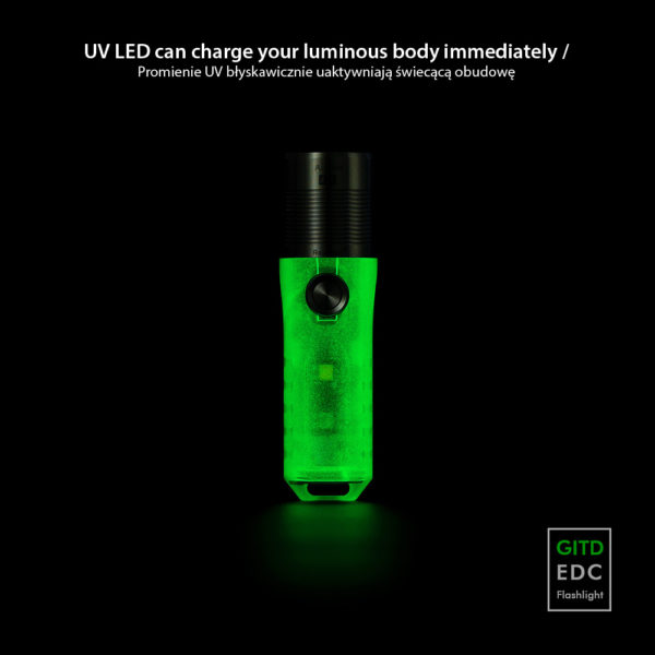 The presented model Aurora A25 GITD White / UVÂ made of durable fluorescent polycarbonate has an efficient CREE XP-L HD V6 LED with maximum output 1000 lumens, and the battery charged via a micro USB connector provides a maximum of 72 hours of work. The flashlight has side lighting, shining white or UV depending on the need. Side lighting activates the fluorescent housing of the flashlight, which, after turning off the LEDs, glows green (GITD function – Glow In The Dark).