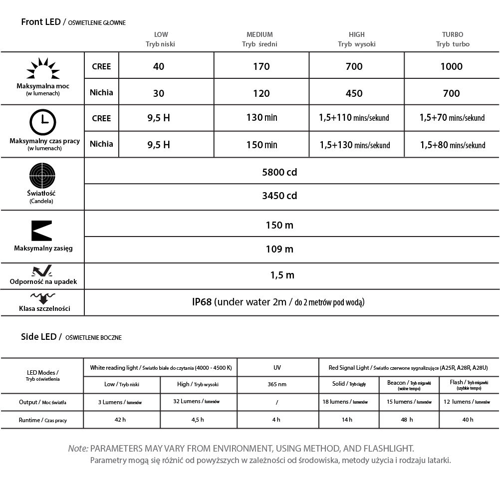 NUMBER OF WORKING MODES: 5 (ofront led), 3 (side leds)