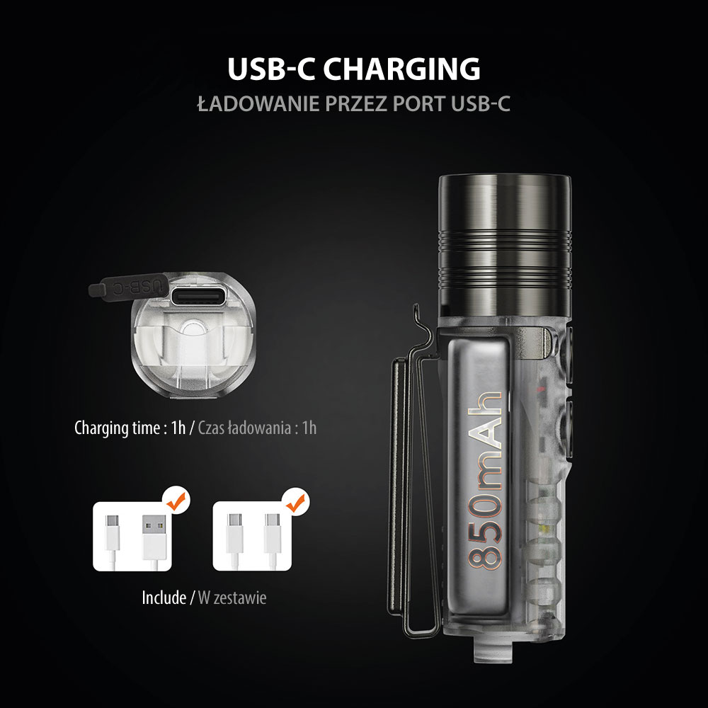 The Aurora A26 G2 is a compact yet bright EDC flashlight, it’s lightweight and durable thanks to its polycarbone material body. It’s equipped with an CREE XP-L HD 6500K cool white LED, a max output of 600 lumens. It runs a 850 mAh battery that can be charged via the USB-C port, when working at moonlight mode, it provides max runtime of 152 hours.