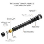 The Aurora A33 is a tail switch penlight, the switch supports quick-action and easy one-hand operation. And it’s powered by a 600mAh built-in rechargeable battery with a constant output of 200 lumens for its size. Its body was crafted from aluminum alloy and features a dragon scale knurling with different colors for a unique look, meeting different preferences, and a great grip. With the deep carry pocket clip, it’s also a carry-well EDC flashlight.