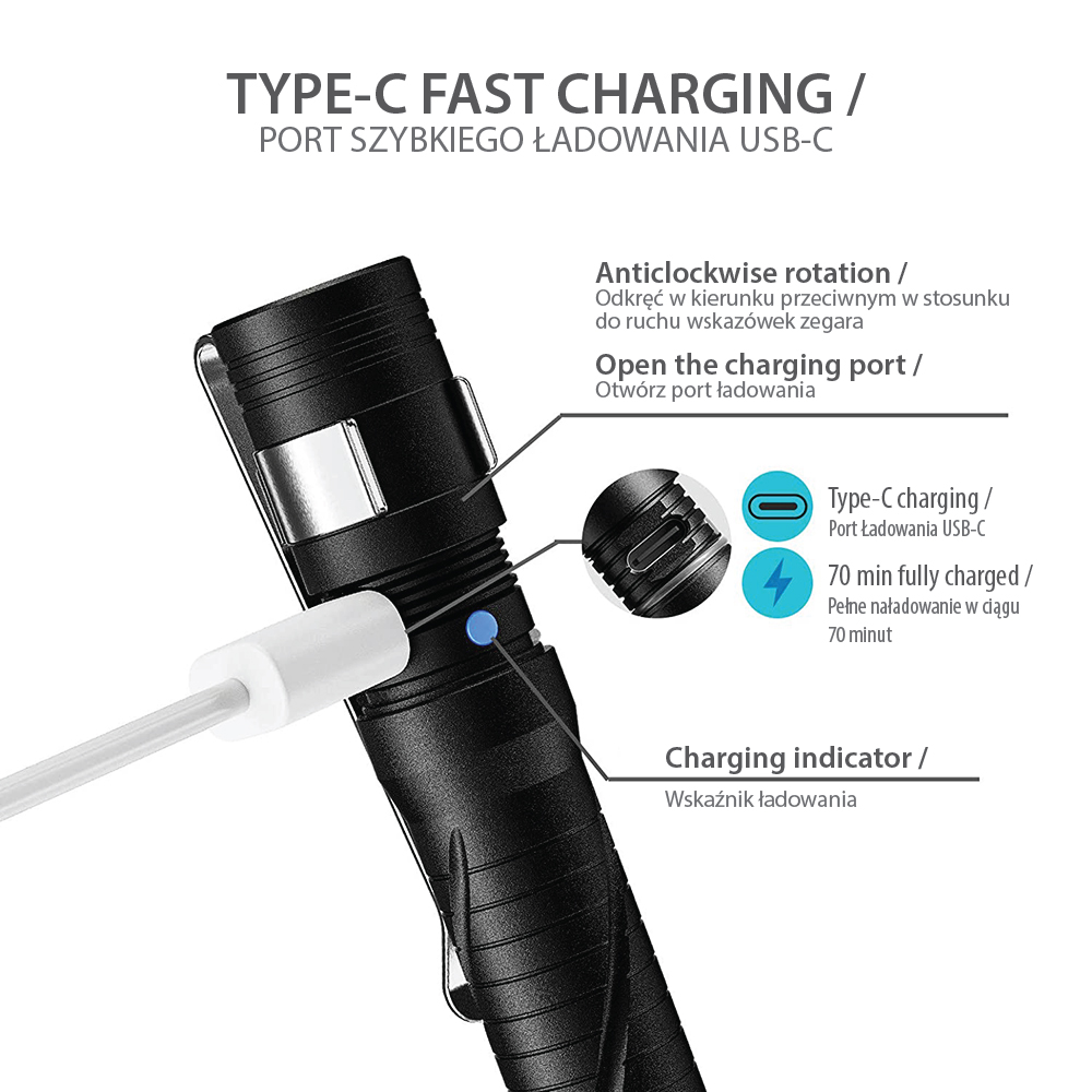 The presented model Aurora A33 Black is made of durable aluminum, has an efficient CREE XP-G2 LED providing maximum output of 200 lumens, and the battery with micro USB charging port. The Aurora A33 ensures maximum 56 hours of working time.