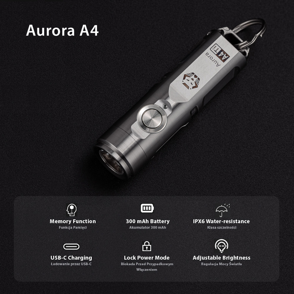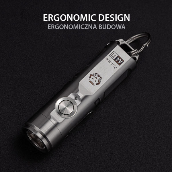 Aurora A4 G4 is a super compact yet bright keychain flashlight, made of titanium. It’s equipped with an SST-20 6500K cool white LED, a max output of 650 lumens. It runs a 300 mAh battery that can be charged via the USB-C port, when working at moonlight mode, it provides max runtime of 56 hours. The new magnetic pocket clip and magnetic tail base buckle are compatible with the Aurora A4.