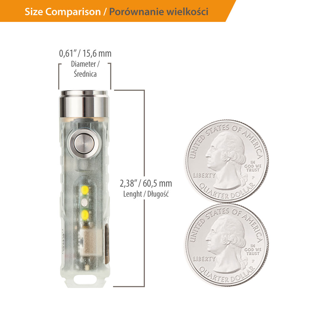 Size: 60.5 mm/2.38”Long, Diameter: 15.6 mm/0.61”, Weight: 17,6 g / 0.62 oz