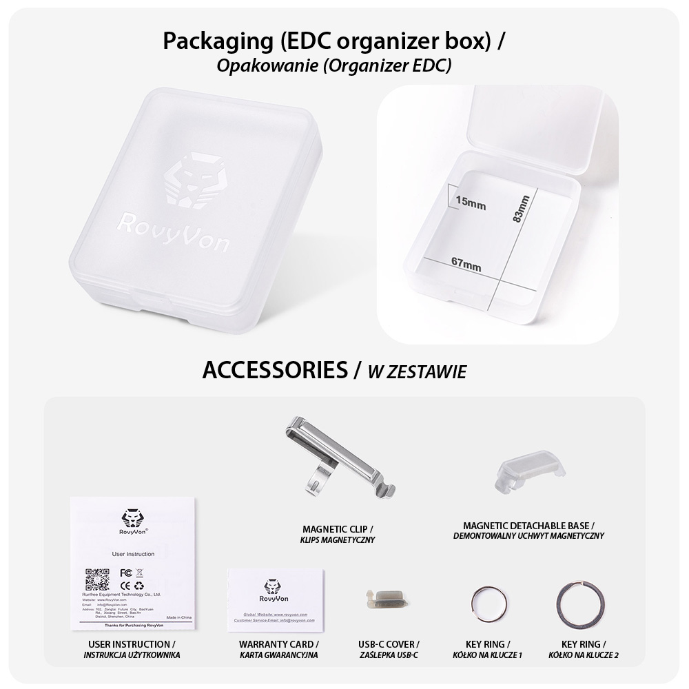 Accessories: 1*User Manual, 1*SS Key Ring, 1*Magnetic Pocket Clip, 1*Magnetic tail base buckle, 1* Warranty Card