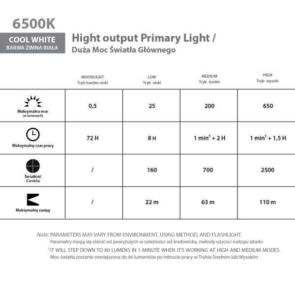 Main Emitter: Luminus SST-20 6500K Cool White, or Nichia 219C 5000K 90 CRI