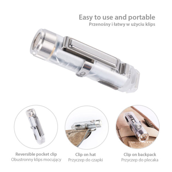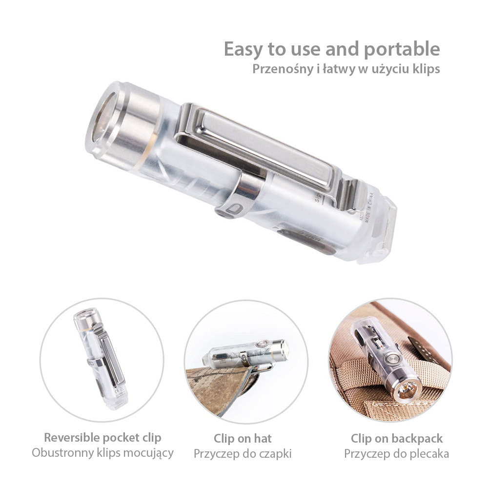 The Aurora A8 G4 is a super compact yet bright keychain flashlight, it’s lightweight and durable thanks to its polyamide material body. It’s equipped with an SST-20 6500K cool white LED, a max output of 650 lumens and a side light. It runs a 330 mAh battery that can be charged via the USB-C port, when working at moonlight mode, it provides max runtime of 72 hours. The new magnetic pocket clip and magnetic tail base buckle are compatible with the Aurora A8.